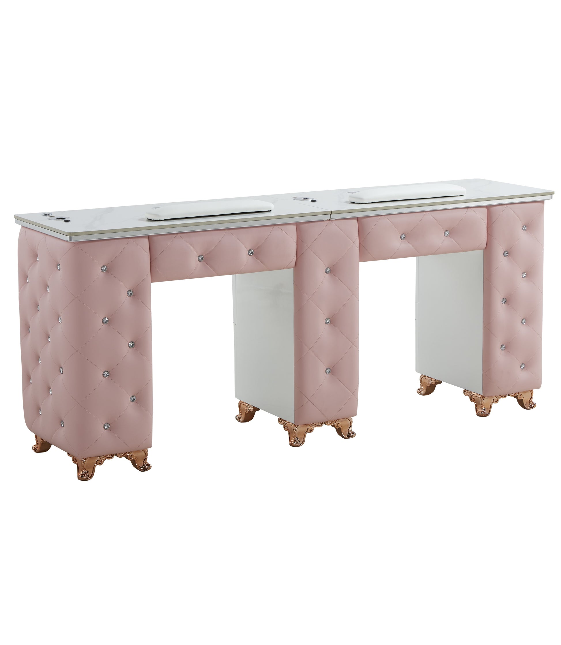Pink Twin Manicure Table Nail Station with LED lights, Ceramic Marble Tops, Dust Collectors